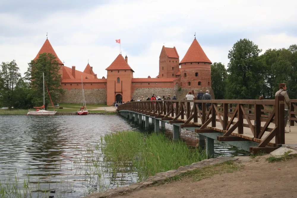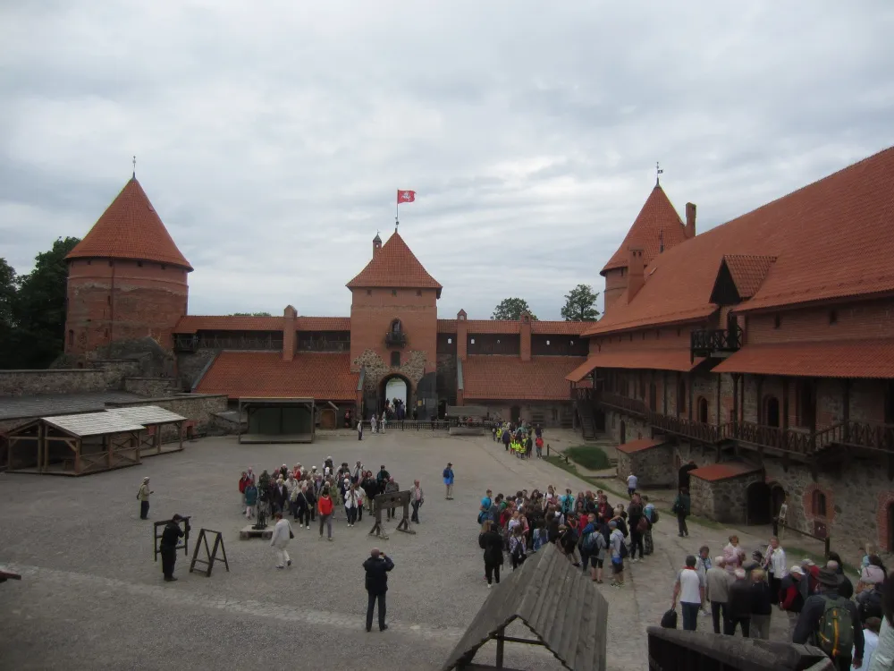 Mercredi 7 juin, 2ième jour : Après le petit déjeuner, départ pour Trakaï et son château gothique (plus ou moins à 30km de Vilnius). Dressé sur une île du lac Galve et relié au village par un long pont en bois, c’est une pure merveille. Construit fin du 14ième siècle, il a été restauré après la Seconde Guerre mondiale. Au départ de la charmante cour intérieure, nous parcourons tous les étages et nous nous plongeons dans la vie moyenâgeuse des Grands-Ducs lituaniens grâce aux informations qui nous sont distillées par notre guide.