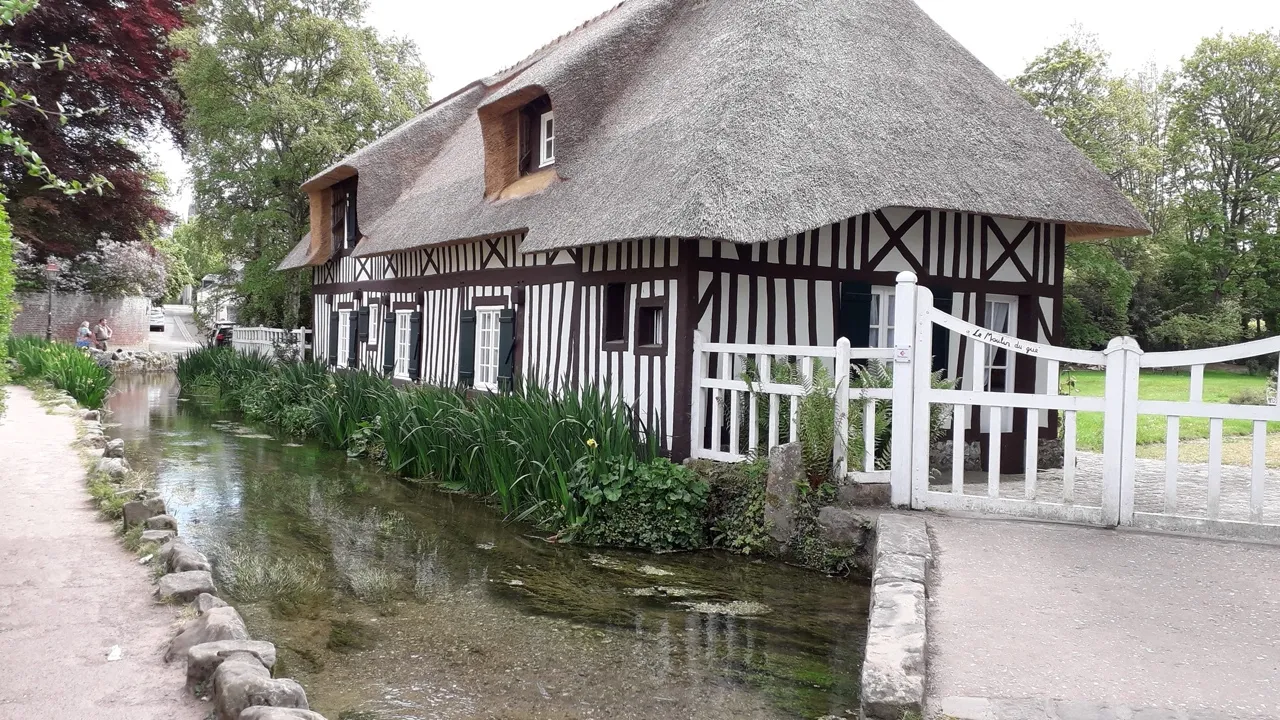 Quand, après un trajet sans problème, nous sommes arrivés à Veules-les-roses, petite localité balnéaire, j’ai vainement cherché un fleuve, même si on prétend que la Veules est le plus petit fleuve de France. Heureusement, une guide locale nous mit directement dans la confidence. En contrebas d’un muret surgissent plusieurs petites sources qui, en se rassemblant, finissent par créer un tout petit cours d’eau qui va finalement se jeter dans la Manche quelques centaines de mètres plus loin. D’où le nom de fleuve. La Veules traverse le village en zigzagant et confère à celui-ci un charme indiscutable. On y retrouve des roses
