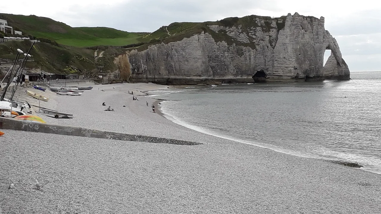 J’aspirais à voir Etretat, ses arcades et ses falaises. La guide locale nous balada dans le village et nous expliqua avec moult exemples les techniques de constructions où alternent la brique, le silex et le grès. Et puis ce fut, enfin, la plage et ces fameuses arcades. Très beau