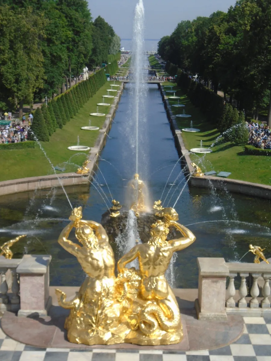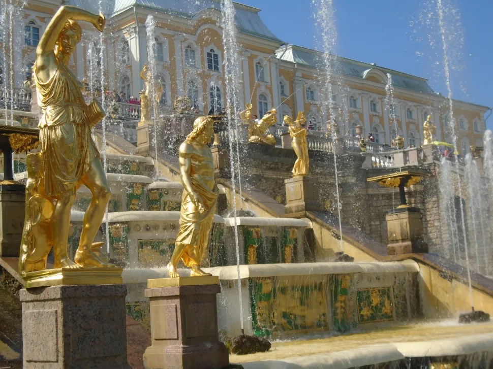 Dernière journée à Saint-Pétersbourg qui se clôture par la visite de Peterhof, ancienne résidence impériale au bord du Golfe de Finlande : un domaine de mille hectares qui comporte une succession de parcs étagés en terrasses, plusieurs palais dont le grand palais avec son escalier monumental, sa salle à manger blanche, sa salle du trône. Quarante-deux fontaines offrent en été un beau spectacle malgré le nombre incalculable de touristes.