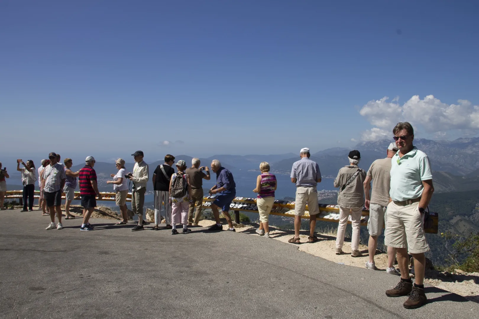 Nous quittons Budva en direction de Tivat : nous allons emprunter la célèbre « Route Serpentine », route de montagne très étroite comportant 26 virages en épingle à cheveux. Par endroits la route est trop étroite pour laisser se croiser 2 voitures ! Que dire quand notre bus rencontre un camion, un camping-car ou tout simplement un chauffeur timoré au volant d’une simple voiture : des marches arrière, des croisements au centimètre et même notre chauffeur qui quitte son car pour prendre le volant de la voiture en face, passage sur le bas-côté tout au bord du ravin, des embouteillages fréquents …. La montée est bien ralentie et compliquée mais en échange, plus on monte et plus la vue est impressionnante sur les Bouches de Kotor, la mer Adriatique et les virages en contrebas.